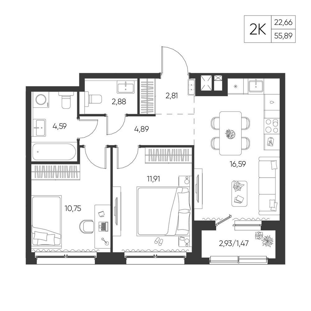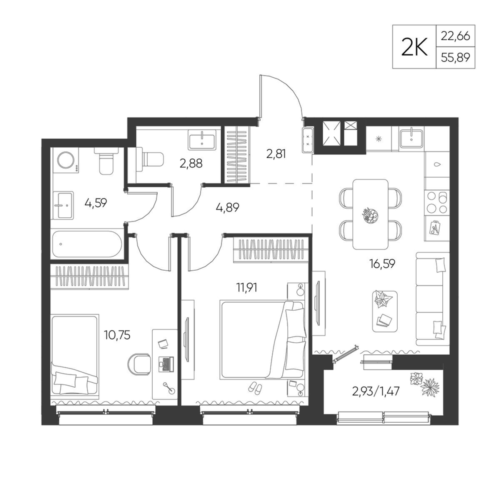 2-комнатная 2 м