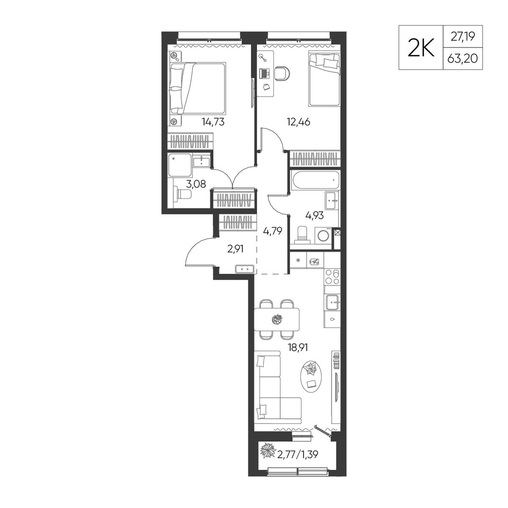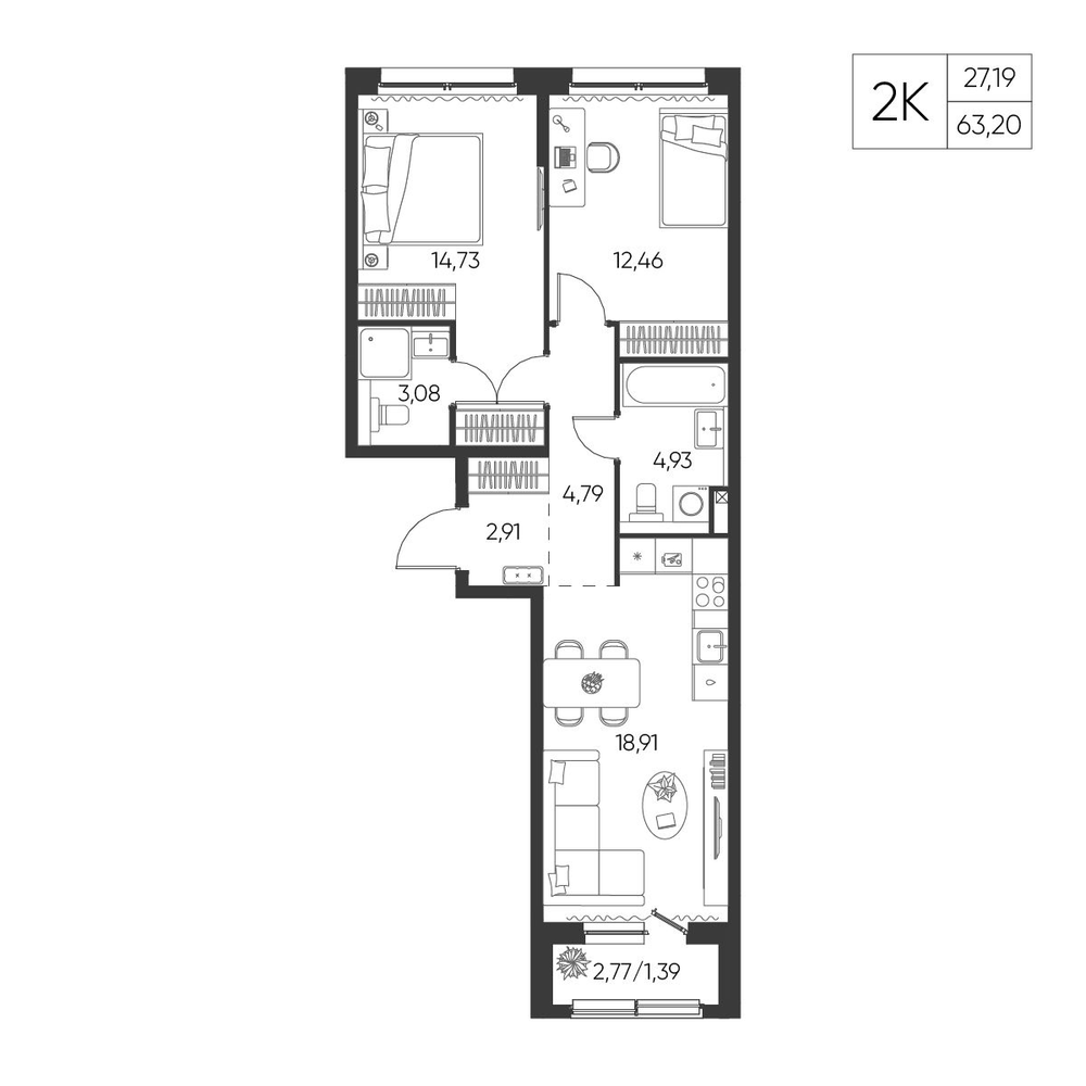 2-комнатная 2 м