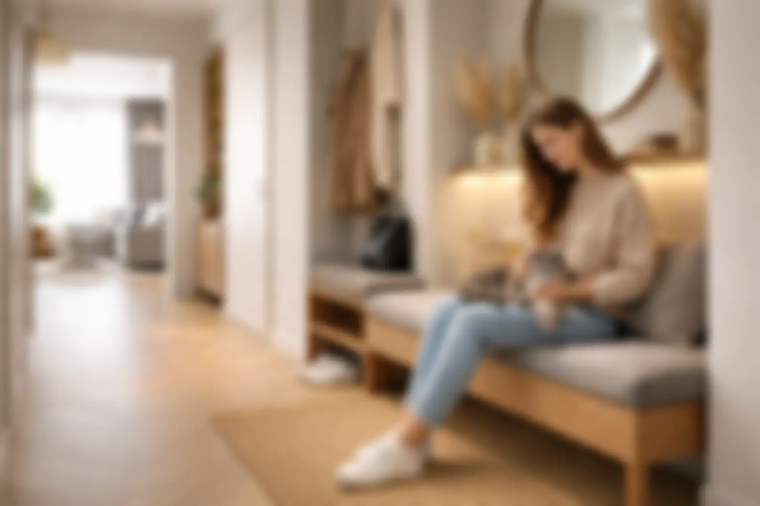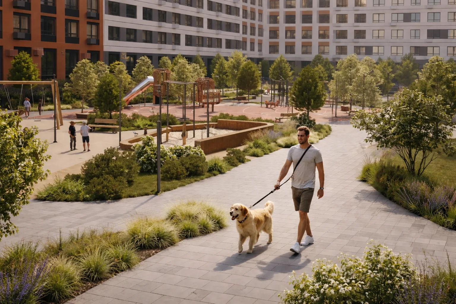 Хозяин со своей собакой спускается во двор и наслаждается зеленым двором жилого комплекса, а перед тем, как вернуться домой, моет лапы собаки в лапомойке. Дома никакой грязи